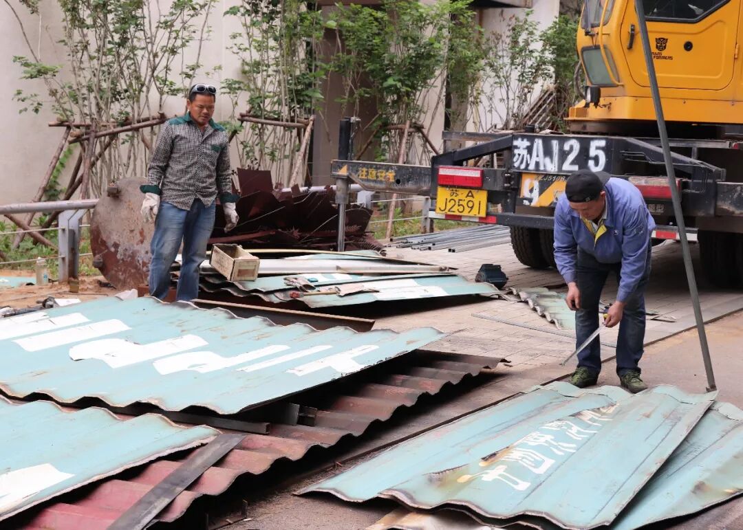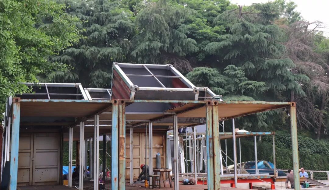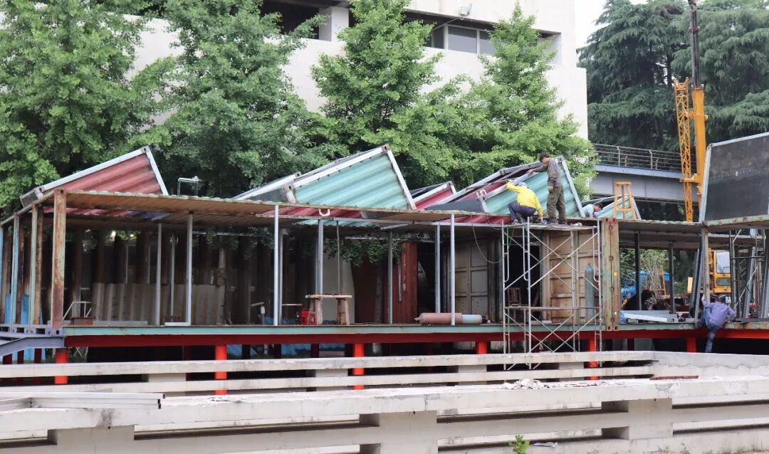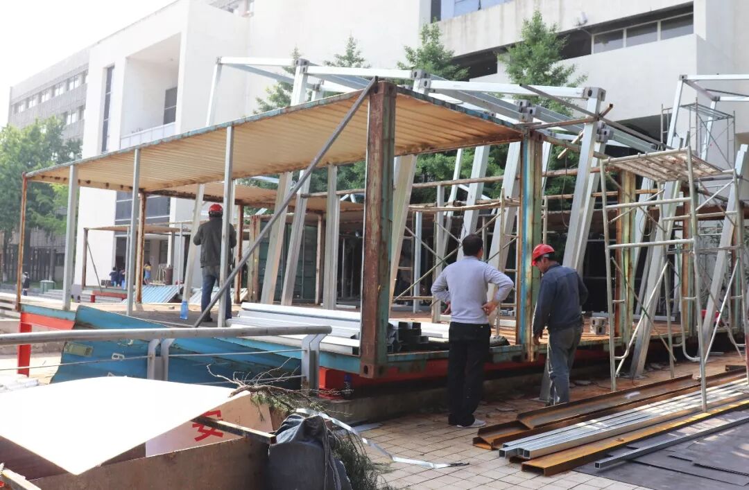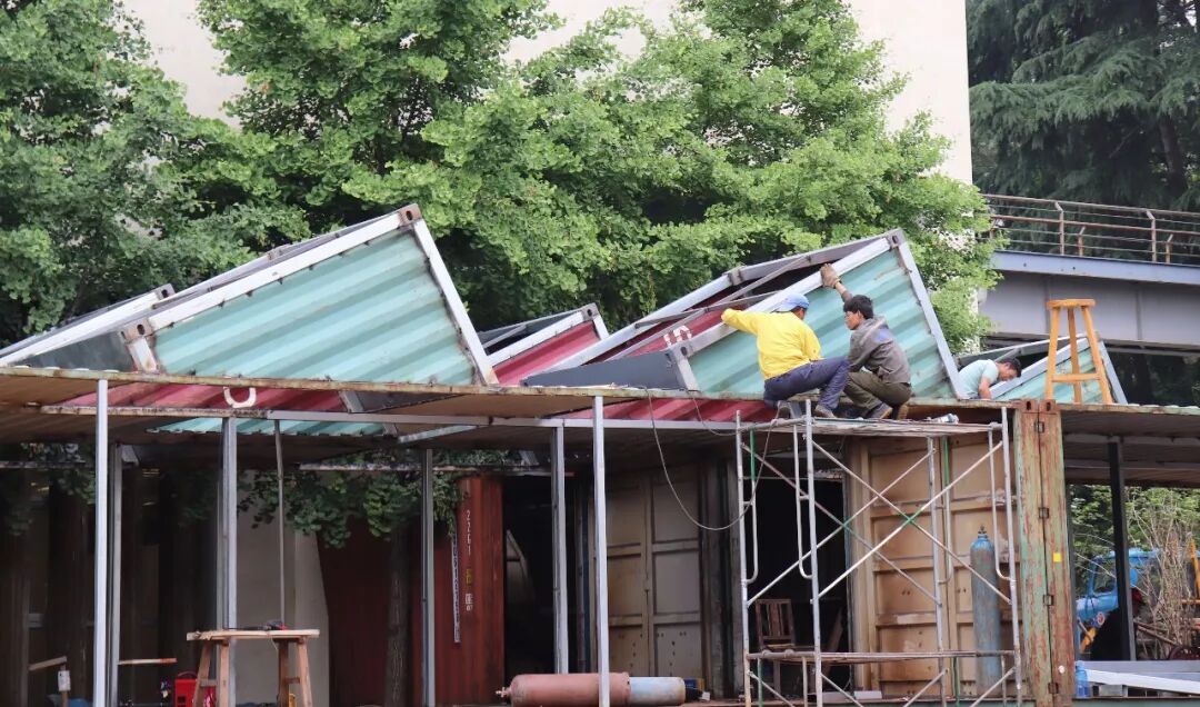 后来由于预算和时间的问题,原本方案中三层之高的集装箱建筑削减了一层半。该集装箱的预计工程是从4月底到5月19号,大概一个月的时间。然而,工期短,论证长一度成为这次毕设无法避免的困难,同学们和工人们历经艰辛,在解决问题的道路上不断探索,每天清晨集装箱都能以不同的面貌出现在我们面前,一切的努力与付出,只为在520得到全南京城的喝彩。