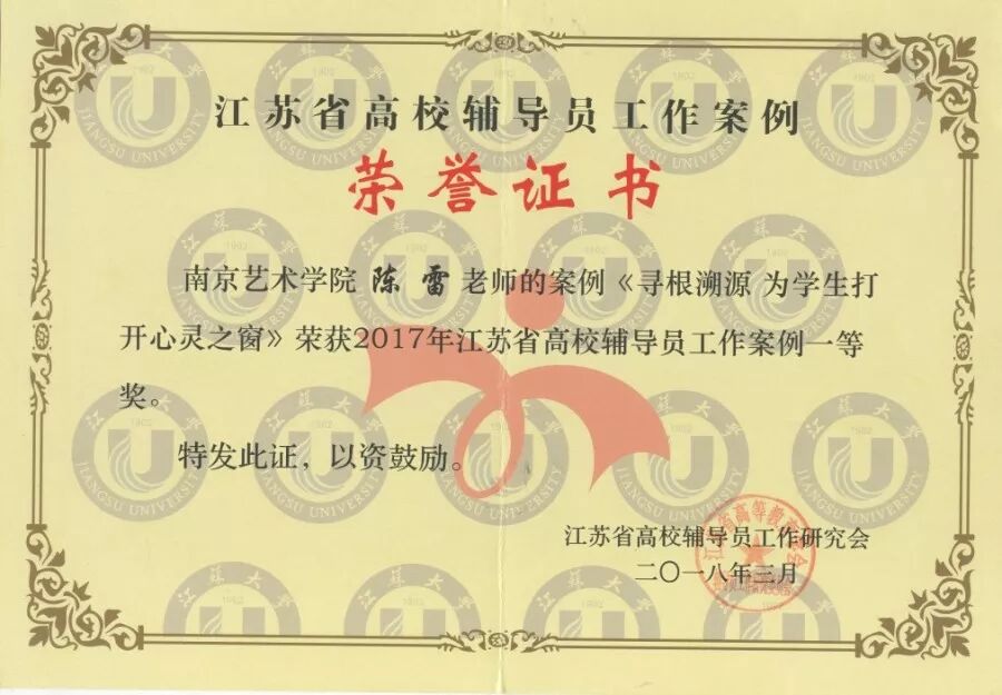 2018年他的工作案例《寻根溯源 为学生打开心灵之窗》获2017年江苏省高校辅导员工作案例一等奖,同年他还发表了另外一篇工作案例论文:《自控自律方能逃离虚拟陷阱——学生网络游戏成瘾案例分析研究》。截止2019年他共发表学术论文11篇,这都是他对自己学生工作的总结和感悟,也是他多年来的工作成果向组织的汇报。