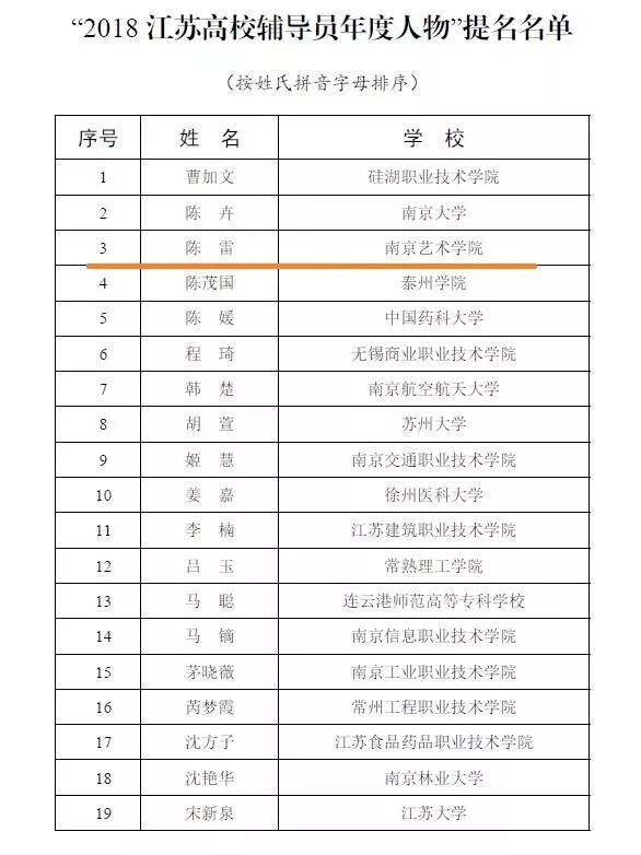 根据《省教育厅关于开展“2018 江苏省大学生年度人物”“2018 江苏高校辅导员年度人物”推选工作的通知》(苏教学函﹝2019﹞5 号)要求,经学校推荐、专家初评,陈志强等30人获“2018 江苏省大学生年度人物”提名,蔡定超等41 人入围“2018 江苏省大学生年度人物”;曹加文等30 人获“2018 江苏高校辅导员年度人物”提名,曹奕等30 人入围“2018 江苏高校辅导员年度人物”。
