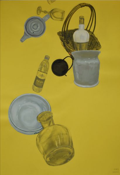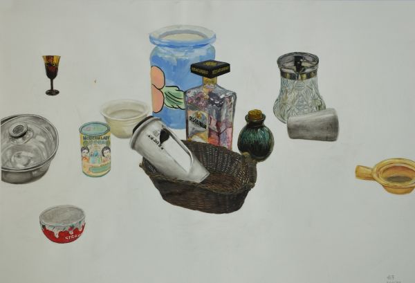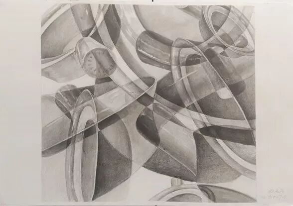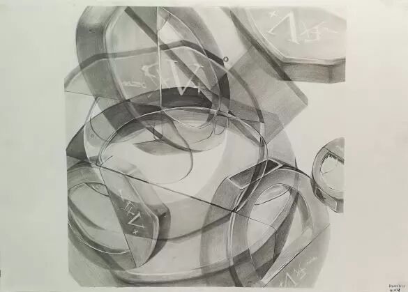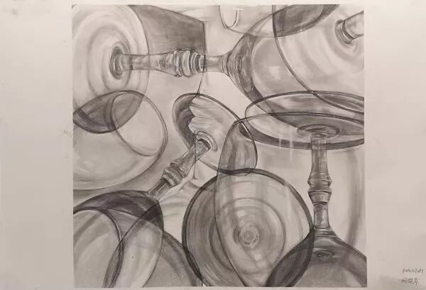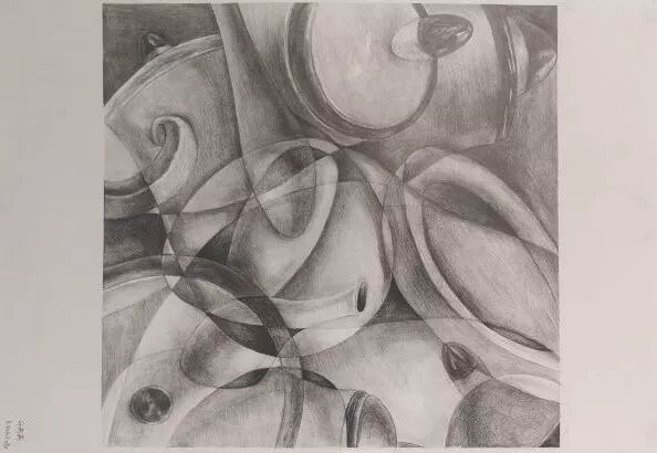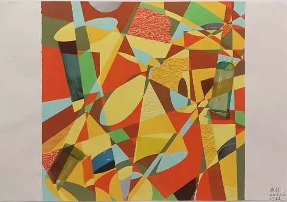 选择某一静物(容器为主),多角度观察物体,拍摄照片,将多个角度的形态用线描的方式描绘下来,再将诸多形态元素进行重叠、错位、放大缩小、旋转、移动等操作,以图底和正负形的关系观察分析画面结构,其次将对画面中各形体元素进行几何化、平面化处理,再运用综合材料拼贴的手法进行表现。画面包含四种不同表现方式:手绘、机理制造与拼贴、照片拼图和计算机滤镜效果等。