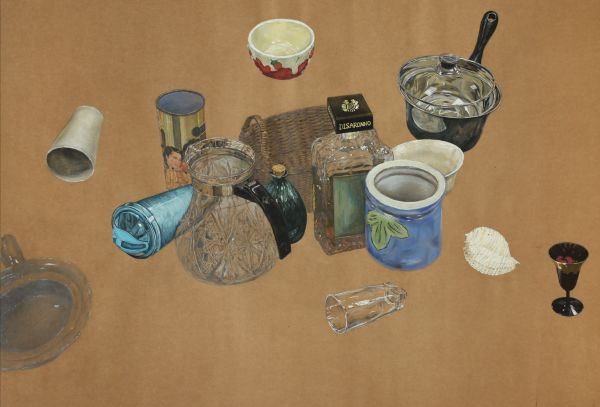 仔细观察面对的一组静物。针对不同的物体,使用不同的绘画工具,运用超写实的手法进行再现,以表现不同物体的真实材料质感及物体不同质感的区别。可以对物体进行挑选,重新安排构图。